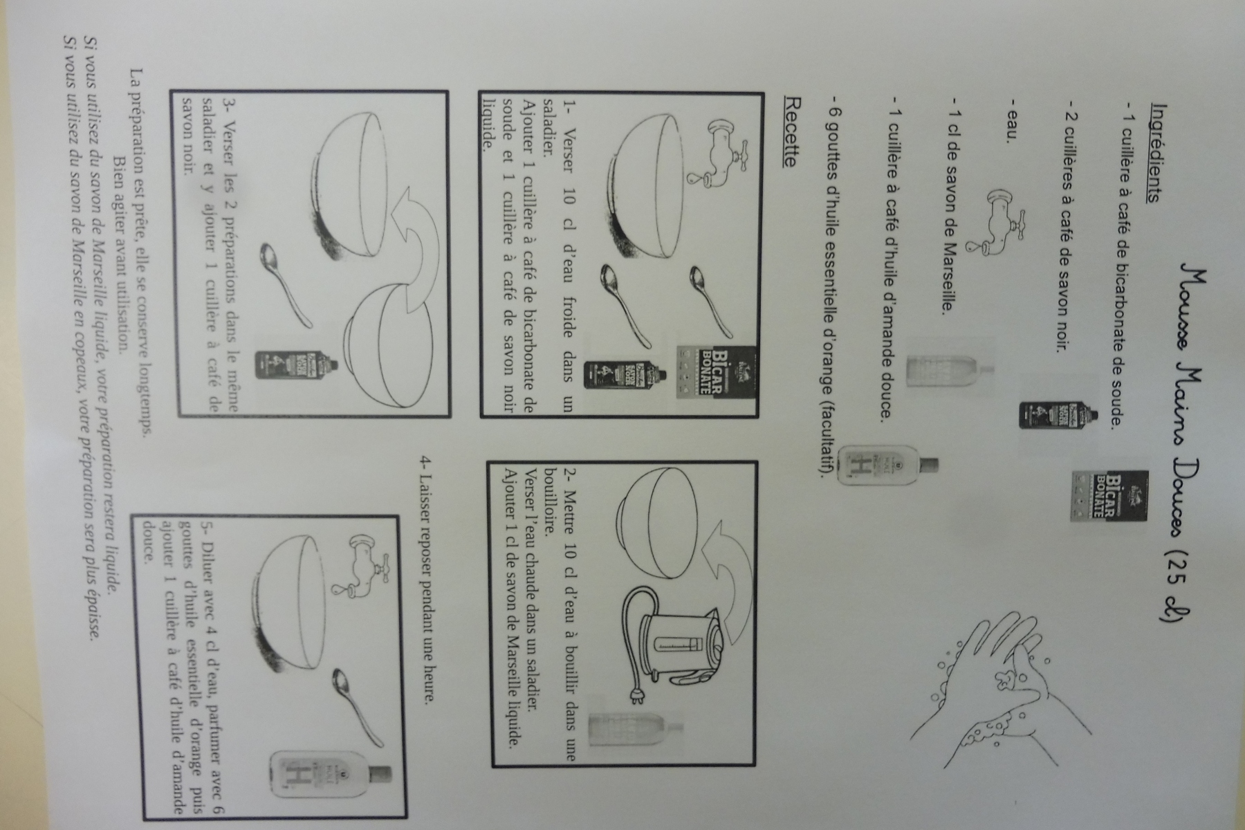 Le mardi 22 avril, au retour des vacances, nous avons réalisé du savon liquide pour vendre au marché de printemps. Il permet d’avoir les mains propres et douces !