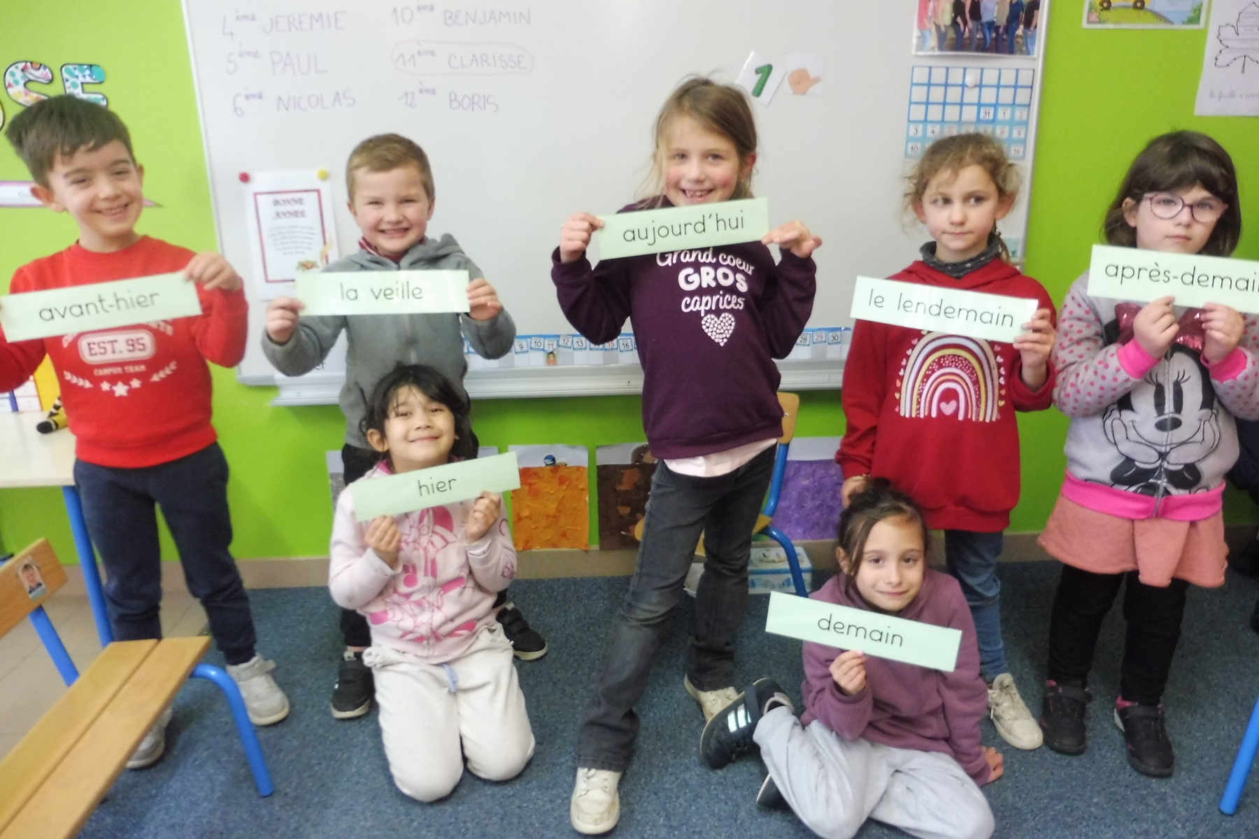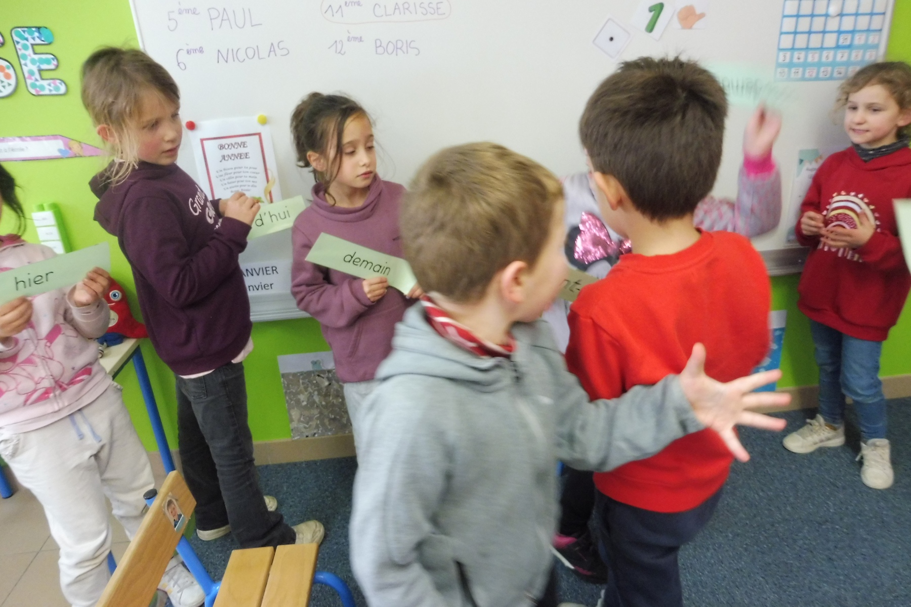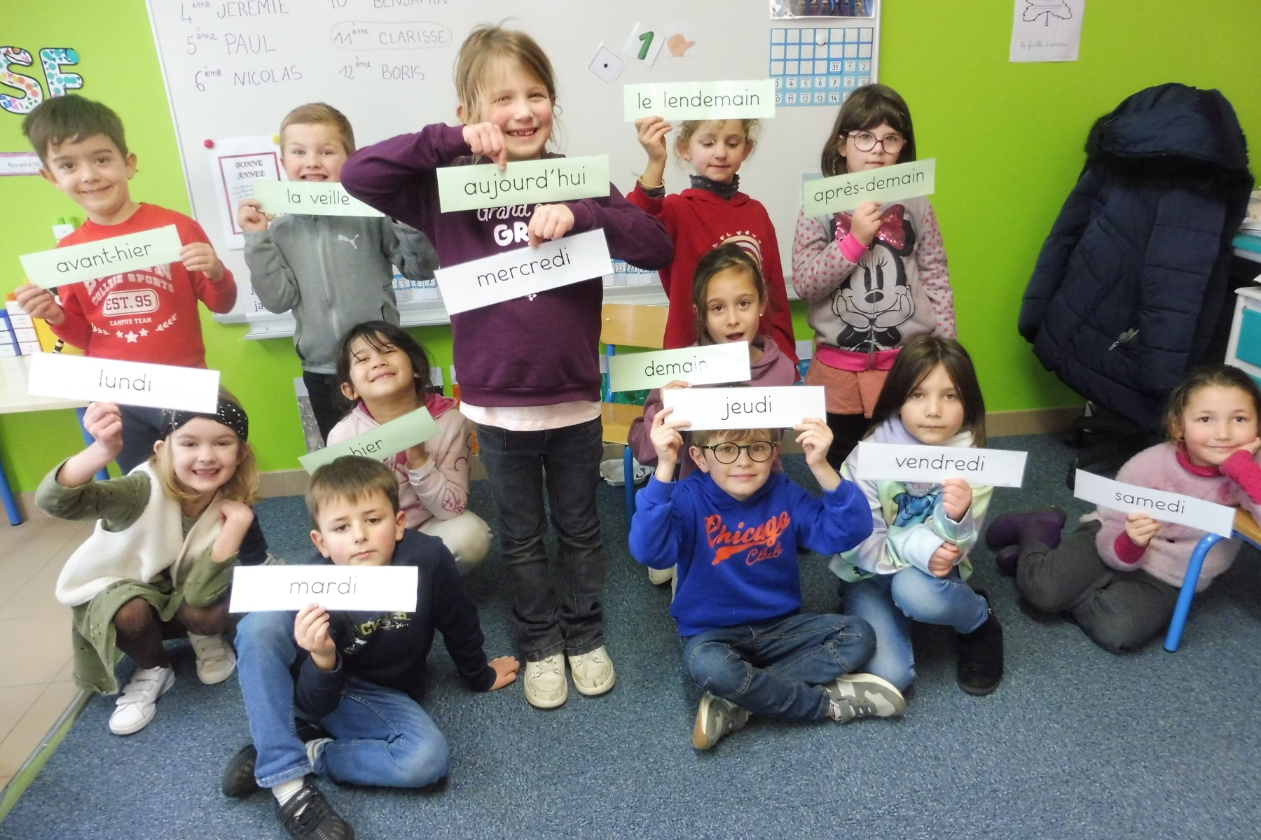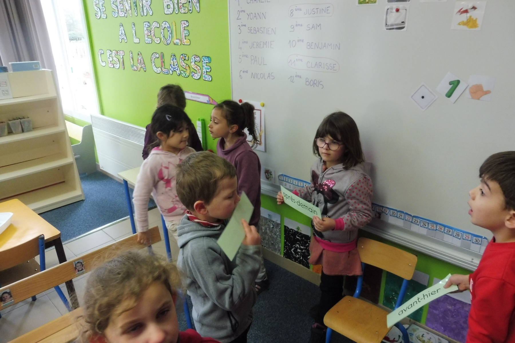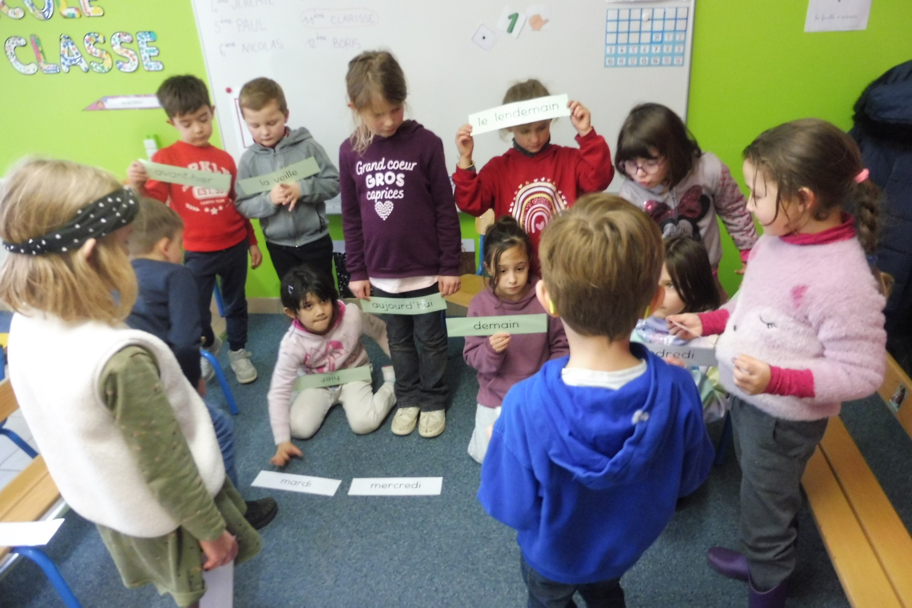 Les CP ont travaillé sur le repérage dans la semaine : connaître le vocabulaire du temps (hier, demain, la veille …) et connaître les jours de la semaine. Ils ont créé un livre de la semaine en y mettant leurs activités scolaires et extra-scolaires puis ont confectionné une roue de la semaine qui montre le caractère cyclique des jours. Dans un autre exercice, ils ont dû se mettre d’accord pour que les étiquettes soient en ordre.