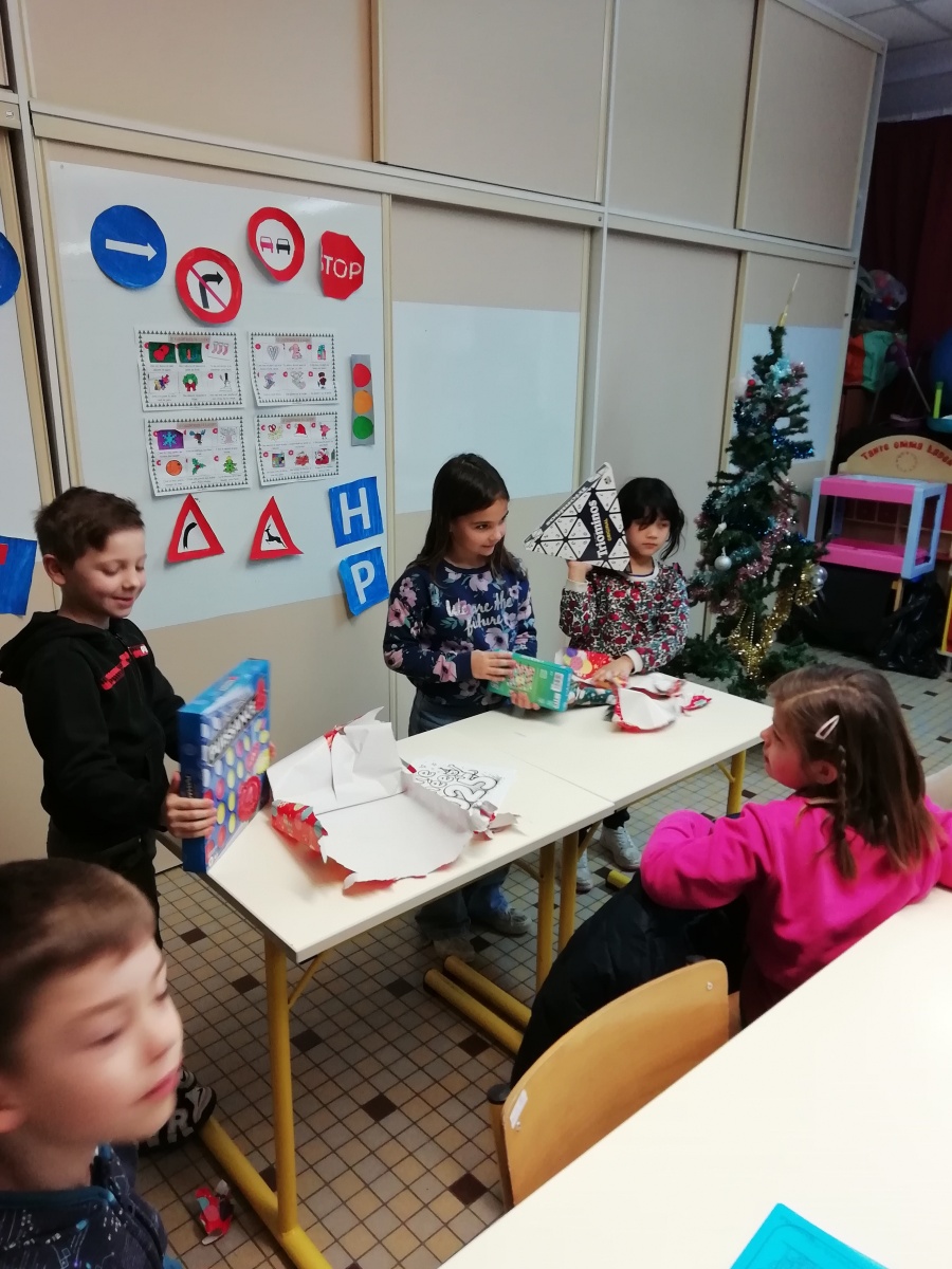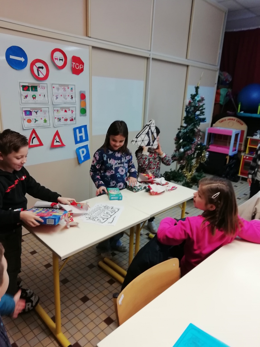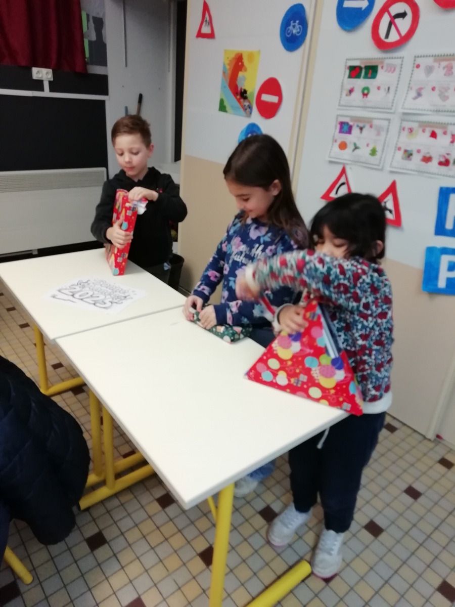 3 cadeaux au pied du sapin de la classe. Après tirage au sort, 3 élèves ont eu le privilège
